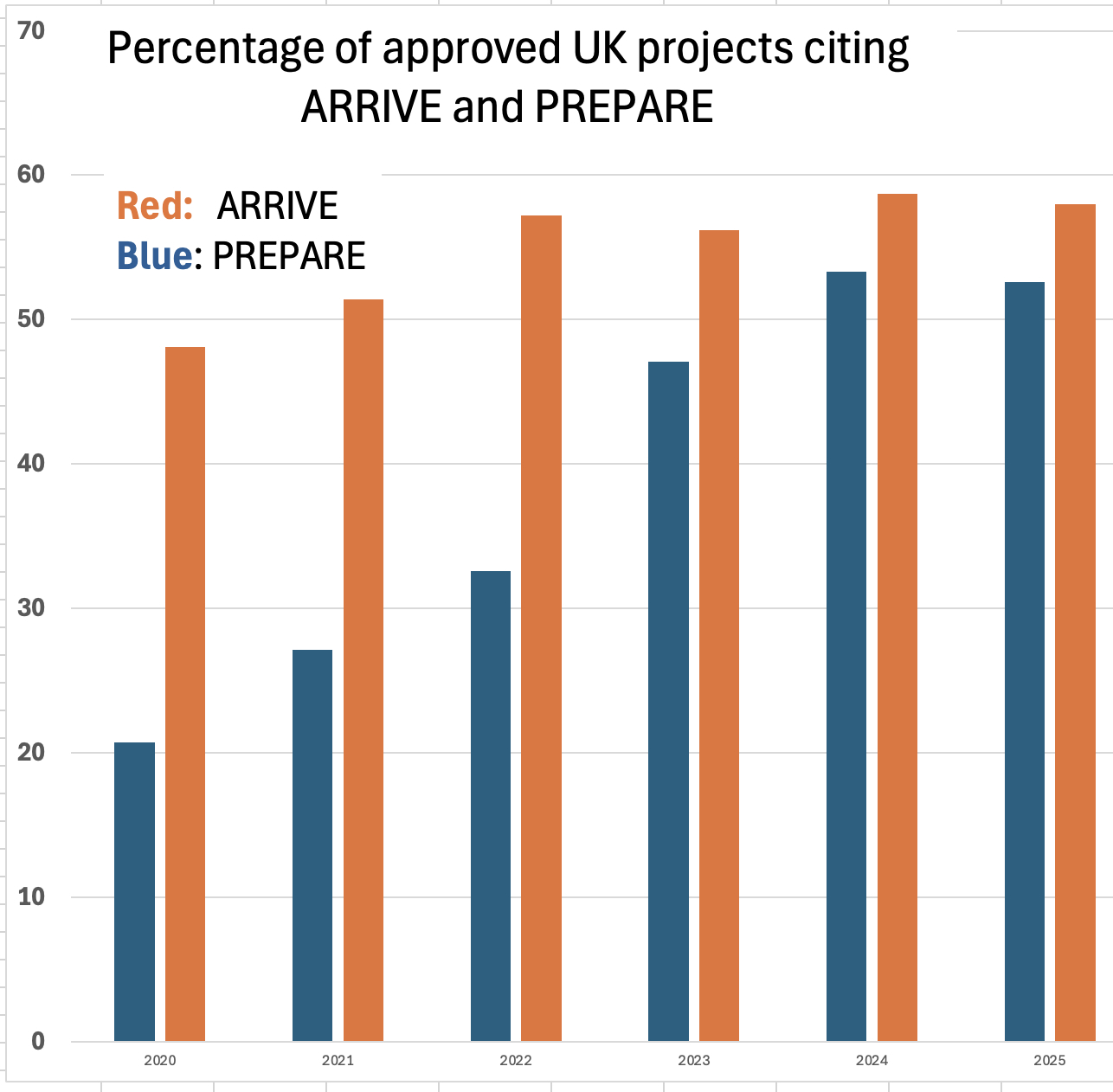 Norecopa has analysed the UK Non-Technical Summaries (NTS) for all approved projects from the beginning of 2020 until the most recent ones available (up to and including September 2025). The use of ARRIVE and PREPARE is shown in the figure.