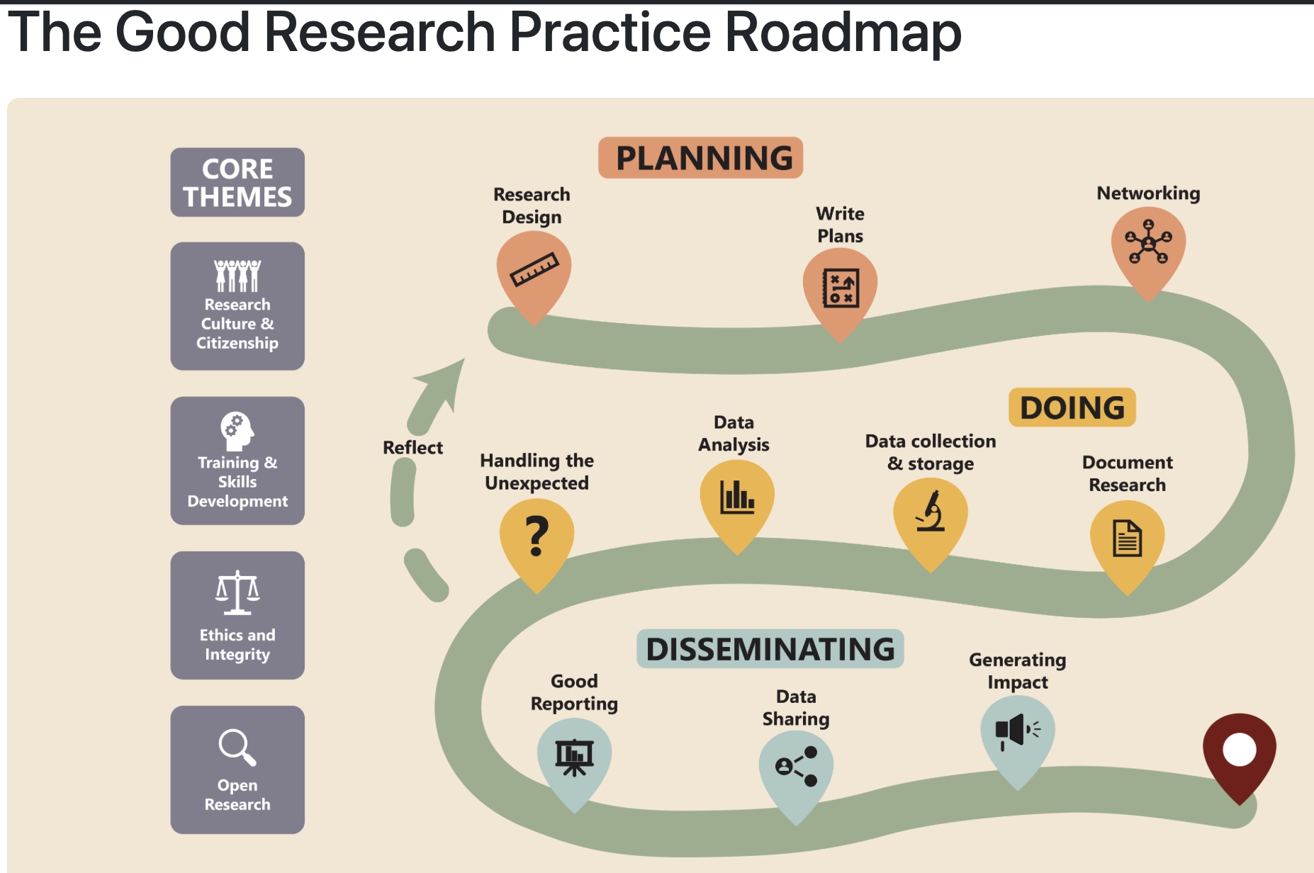 Roadmap for Good Research Practice (see illustration), detailing the importance of all the steps in planning, conducting and disseminating research, ensuring it is transparent, of high quality, ethical, and impactful.